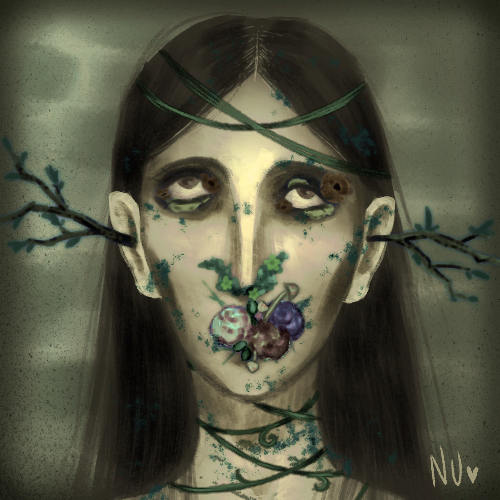 From her mouth burst wildflowers and mushrooms and tiny blades of grass.